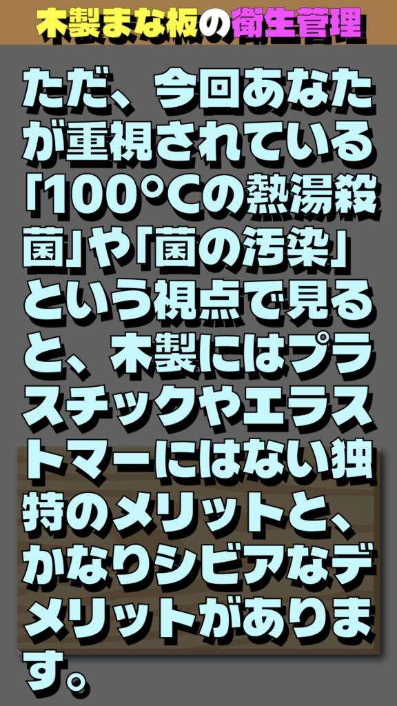 ただ、今回あなたが重視されている**「100°Cの熱湯殺菌」や「菌の汚染」という視点で見ると、木製にはプラスチックやエラストマーにはない独特のメリットと、かなりシビアなデメリット**があります。