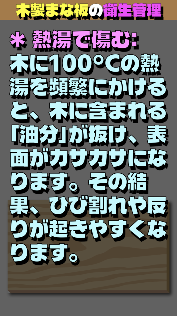 * 熱湯で傷む: 木に100°Cの熱湯を頻繁にかけると、木に含まれる「油分」が抜け、表面がカサカサになります。その結果、ひび割れや反りが起きやすくなります。