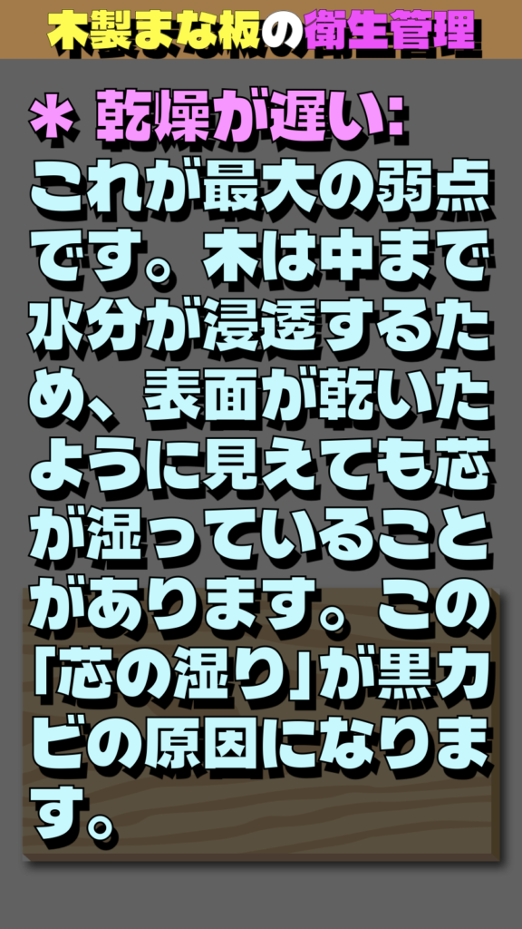 * 乾燥が遅い: これが最大の弱点です。木は中まで水分が浸透するため、表面が乾いたように見えても芯が湿っていることがあります。この「芯の湿り」が黒カビの原因になります。