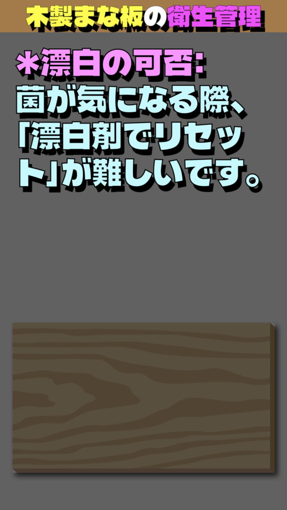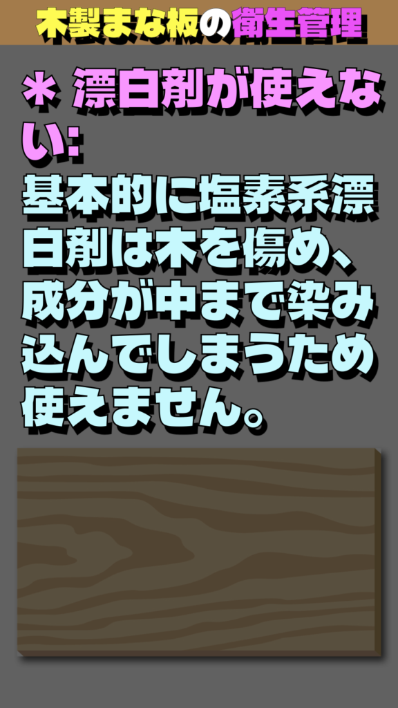 * 漂白剤が使えない: 基本的に塩素系漂白剤は木を傷め、成分が中まで染み込んでしまうため使えません。