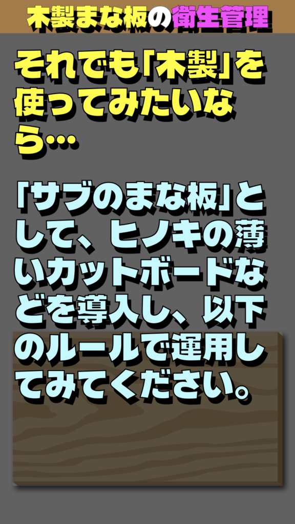 「サブのまな板」として、ヒノキの薄いカットボードなどを導入し、以下のルールで運用してみてください。