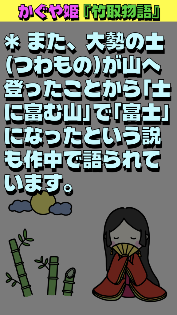 * また、大勢の士(つわもの)が山へ登ったことから「士に富む山」で「富士」になったという説も作中で語られています。