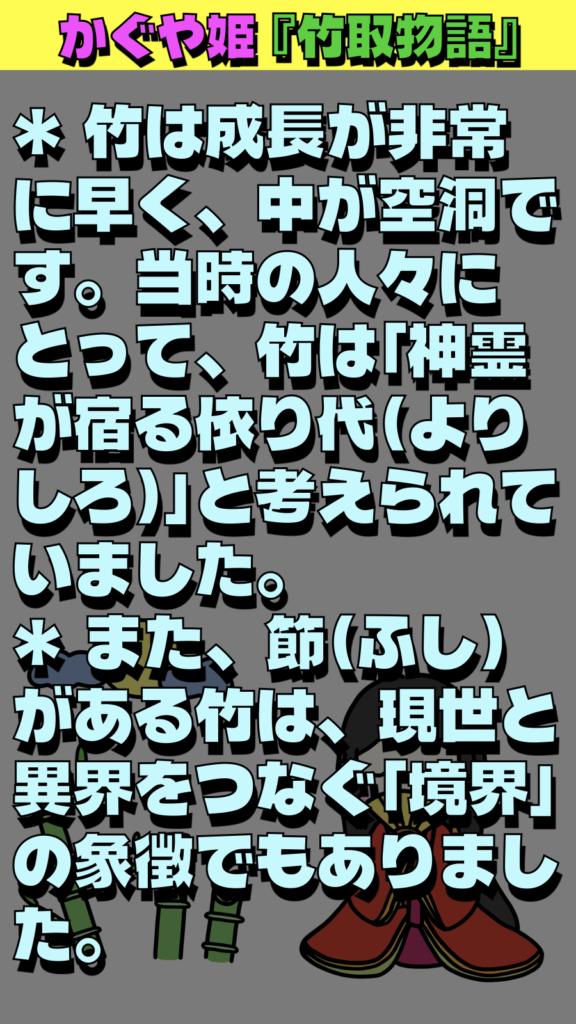 * 竹は成長が非常に早く、中が空洞です。当時の人々にとって、竹は「神霊が宿る依り代(よりしろ)」と考えられていました。