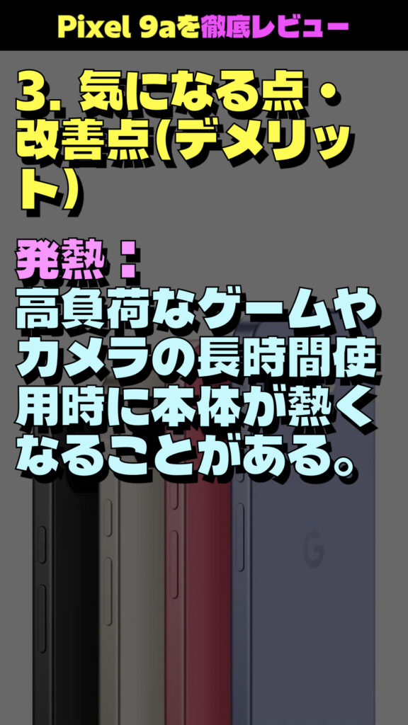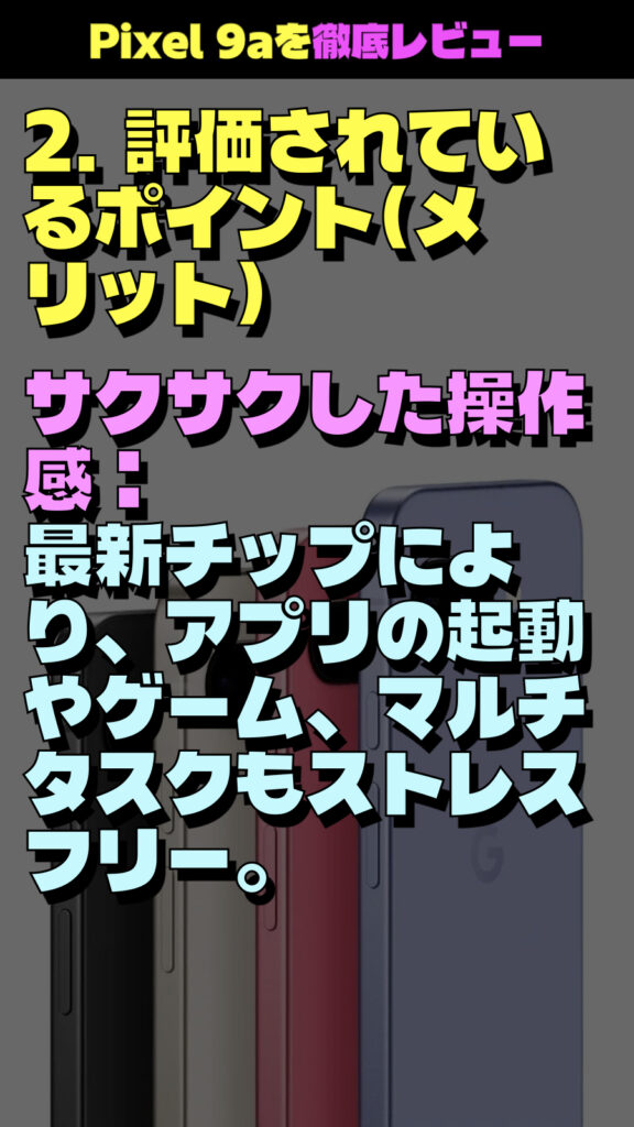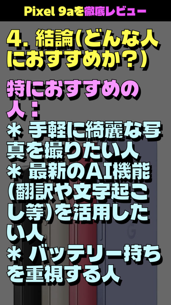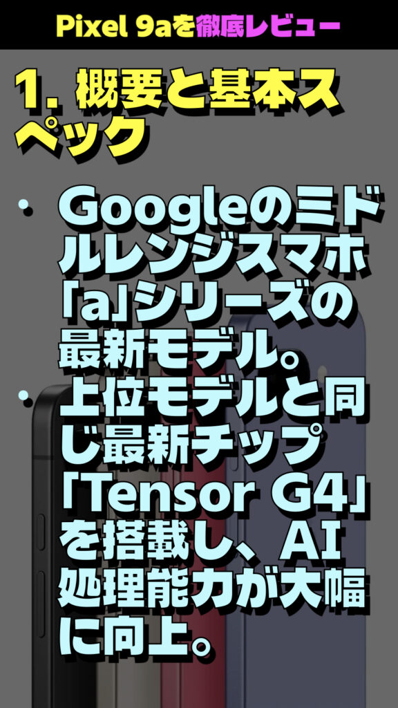 Google Pixel 9aに関して、わかりやすく箇条書きでまとめました。