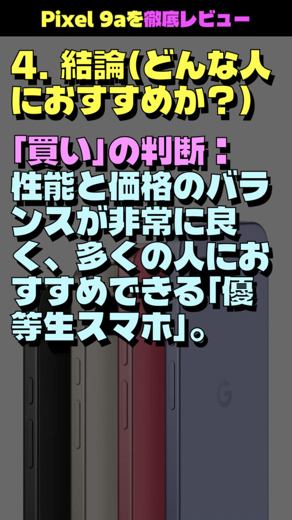 * 「買い」の判断: 性能と価格のバランスが非常に良く、多くの人におすすめできる「優等生スマホ」。