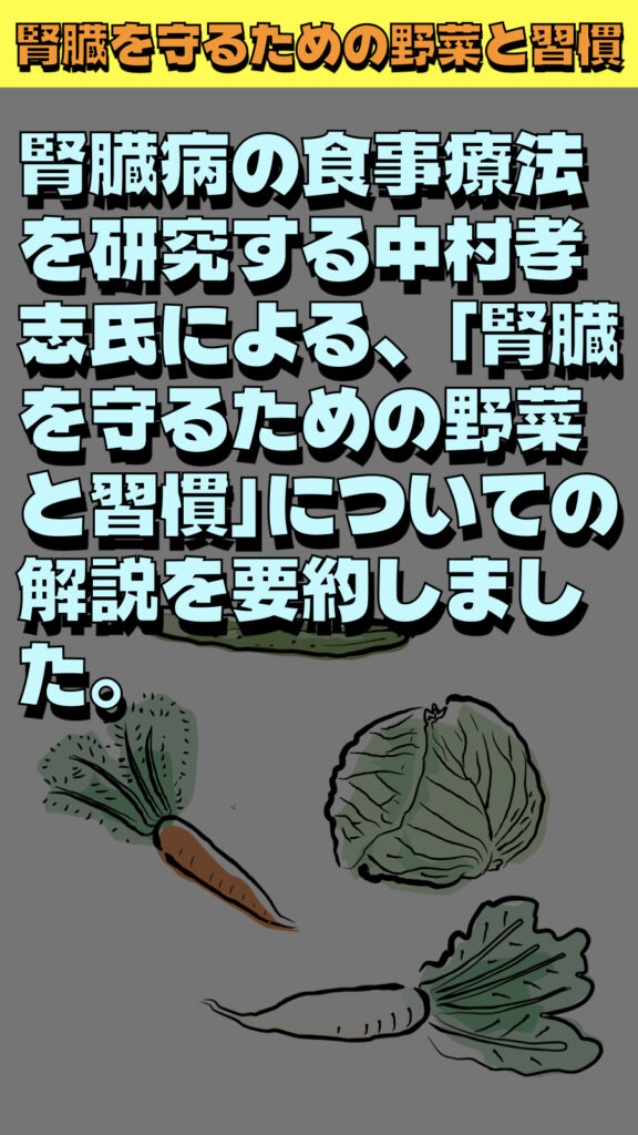 腎臓病の食事療法を研究する中村孝志氏による、「腎臓を守るための野菜と習慣」についての解説を要約しました。