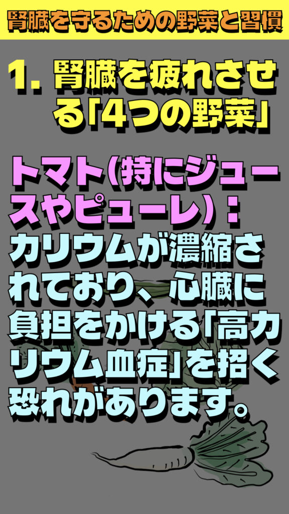 • トマト(特にジュースやピューレ): カリウムが濃縮されており、心臓に負担をかける「高カリウム血症」を招く恐れがあります。