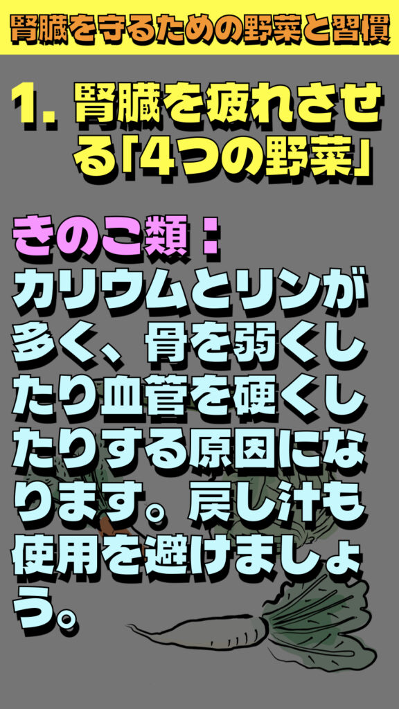 • きのこ類: カリウムとリンが多く、骨を弱くしたり血管を硬くしたりする原因になります。戻し汁も使用を避けましょう。