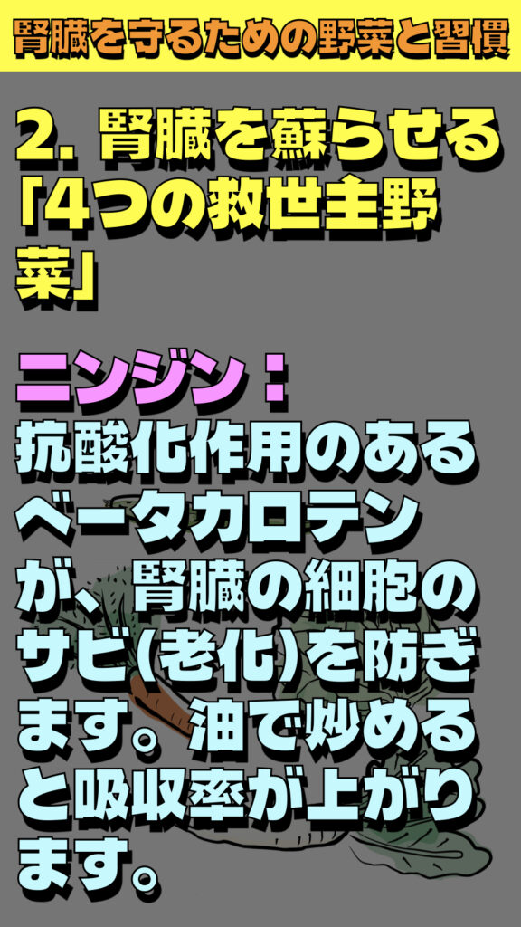 • ニンジン: 抗酸化作用のあるベータカロテンが、腎臓の細胞のサビ(老化)を防ぎます。油で炒めると吸収率が上がります。