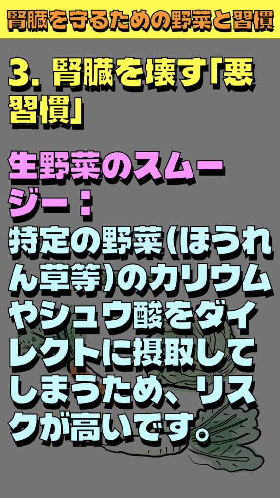 • 生野菜のスムージー: 特定の野菜(ほうれん草等)のカリウムやシュウ酸をダイレクトに摂取してしまうため、リスクが高いです。