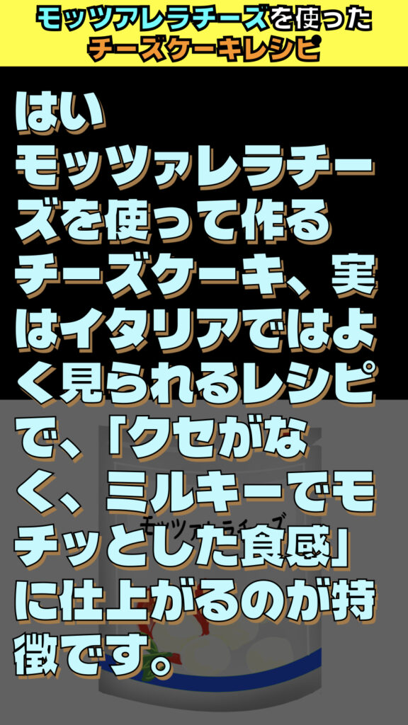 モッツァレラチーズを使って作るチーズケーキ、実はイタリアではよく見られるレシピで、**「クセがなく、ミルキーでモチッとした食感」**に仕上がるのが特徴です。