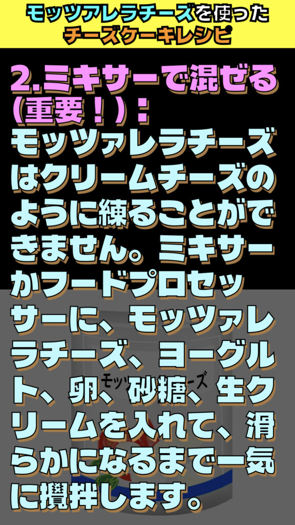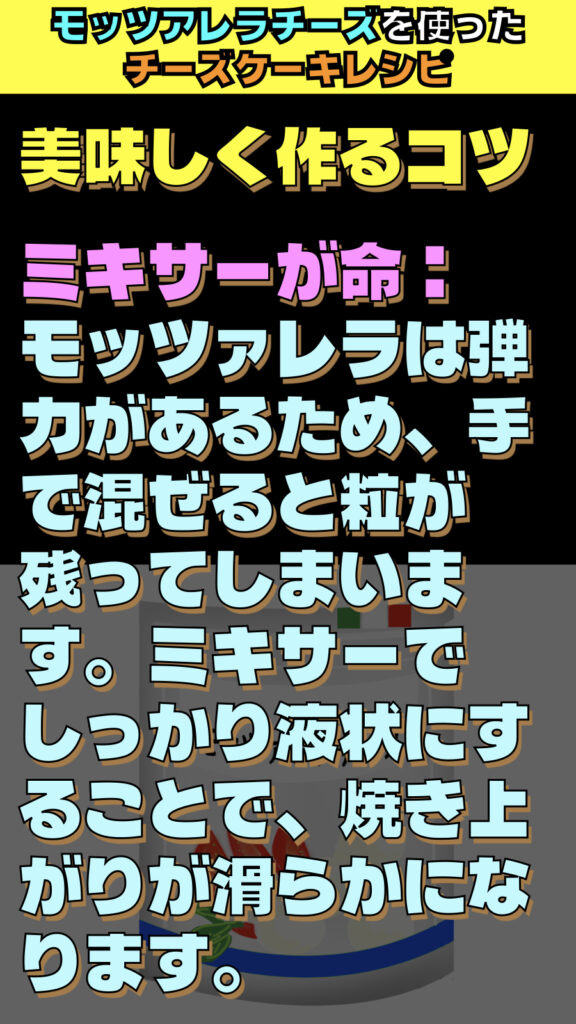 - ミキサーが命: モッツァレラは弾力があるため、手で混ぜると粒が残ってしまいます。ミキサーでしっかり液状にすることで、焼き上がりが滑らかになります。