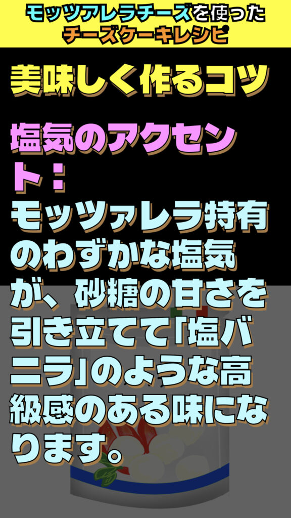 - 塩気のアクセント: モッツァレラ特有のわずかな塩気が、砂糖の甘さを引き立てて「塩バニラ」のような高級感のある味になります。