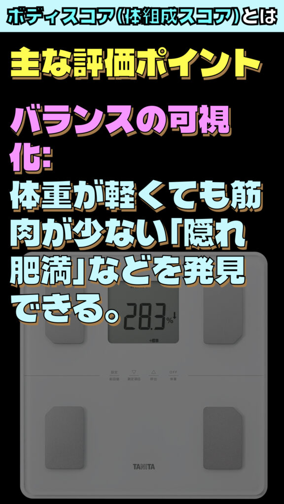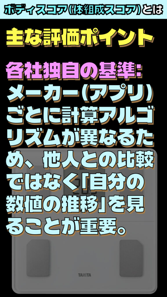 • モチベーション維持: 体重に変化がなくても、体組成が改善されればスコアが上がるため、運動の成果を実感しやすい。