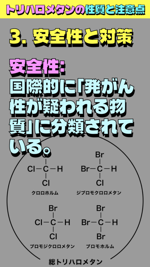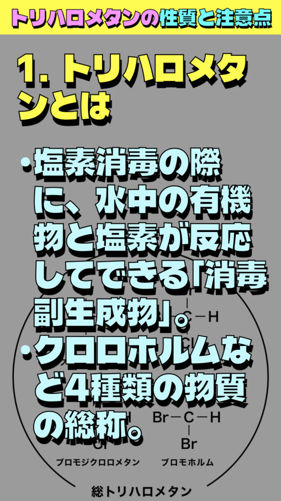 • 塩素消毒の際に、水中の有機物と塩素が反応してできる「消毒副生成物」。
