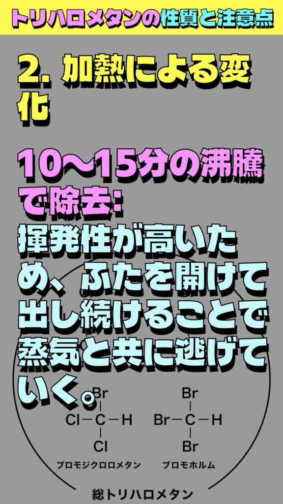 • 沸騰直後に急増: 水温が上がると化学反応が加速し、元の水の2〜3倍に濃度が上がる。