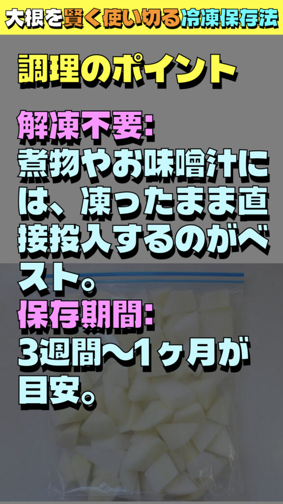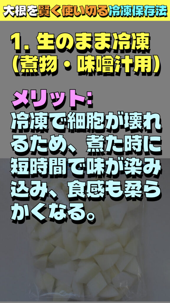 • メリット: 冷凍で細胞が壊れるため、煮た時に短時間で味が染み込み、食感も柔らかくなる。
