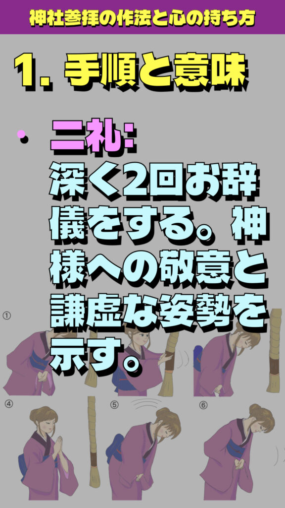 • 二礼: 深く2回お辞儀をする。神様への敬意と謙虚な姿勢を示す。