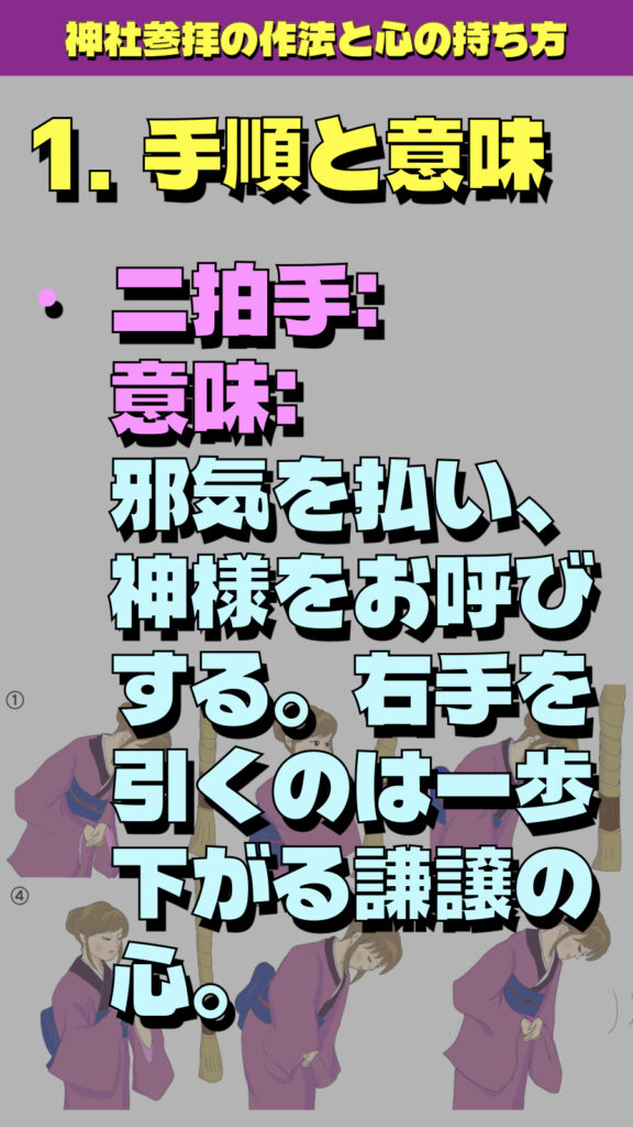 • 意味: 邪気を払い、神様をお呼びする。右手を引くのは一歩下がる謙譲の心。