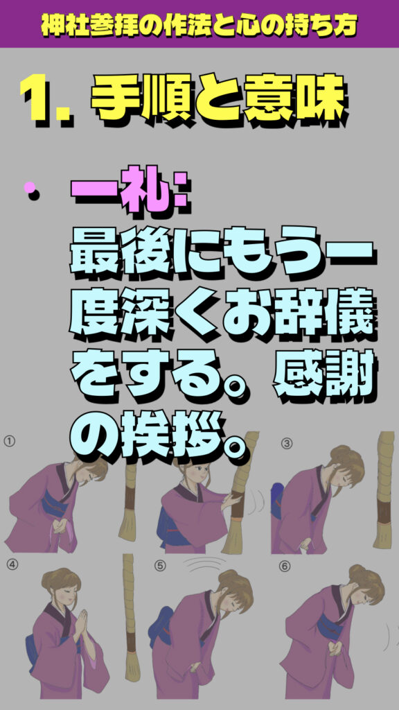• 一礼: 最後にもう一度深くお辞儀をする。感謝の挨拶。