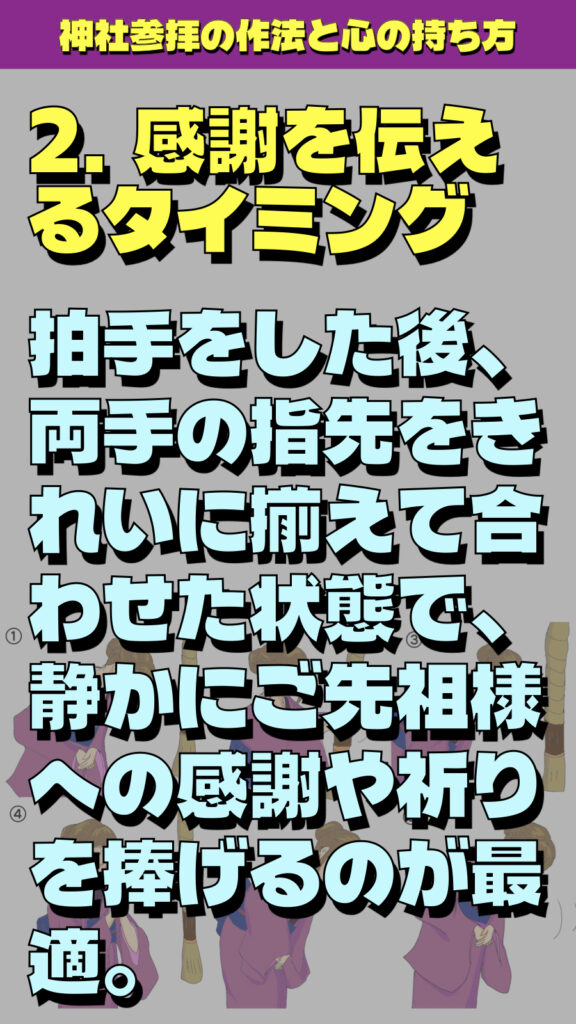 • 二拍手: 胸の高さで手を合わせ、右手を少し手前に引いて2回打つ。その後、指先を揃える。