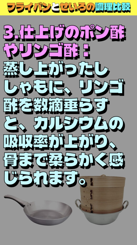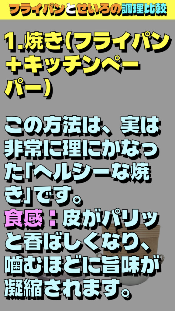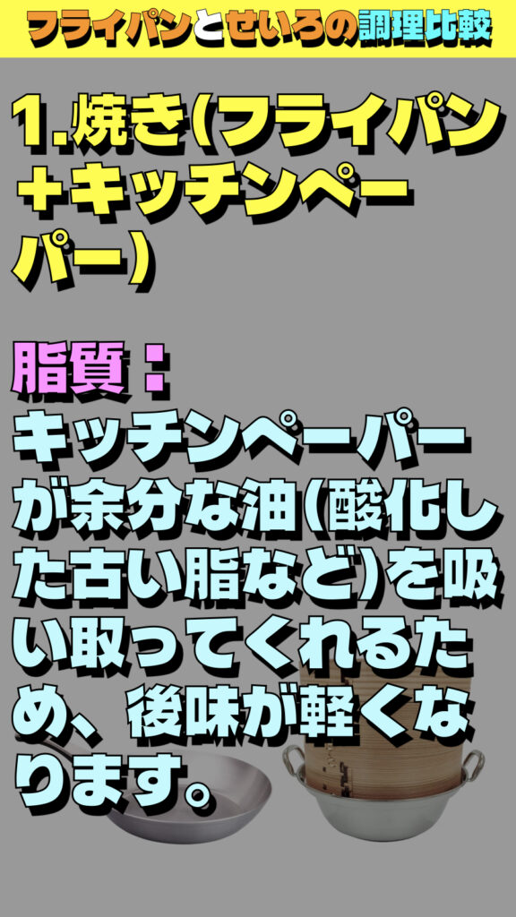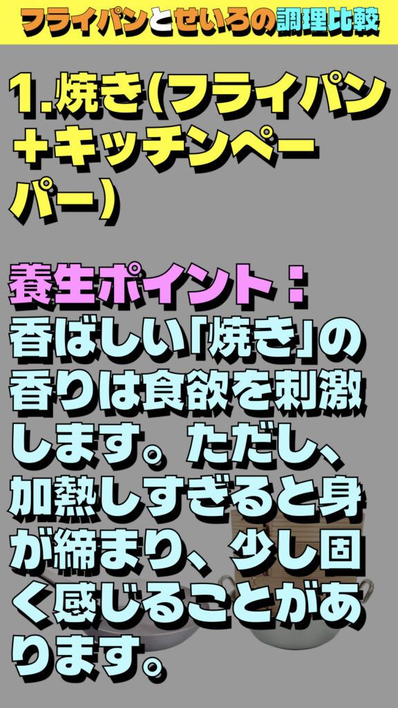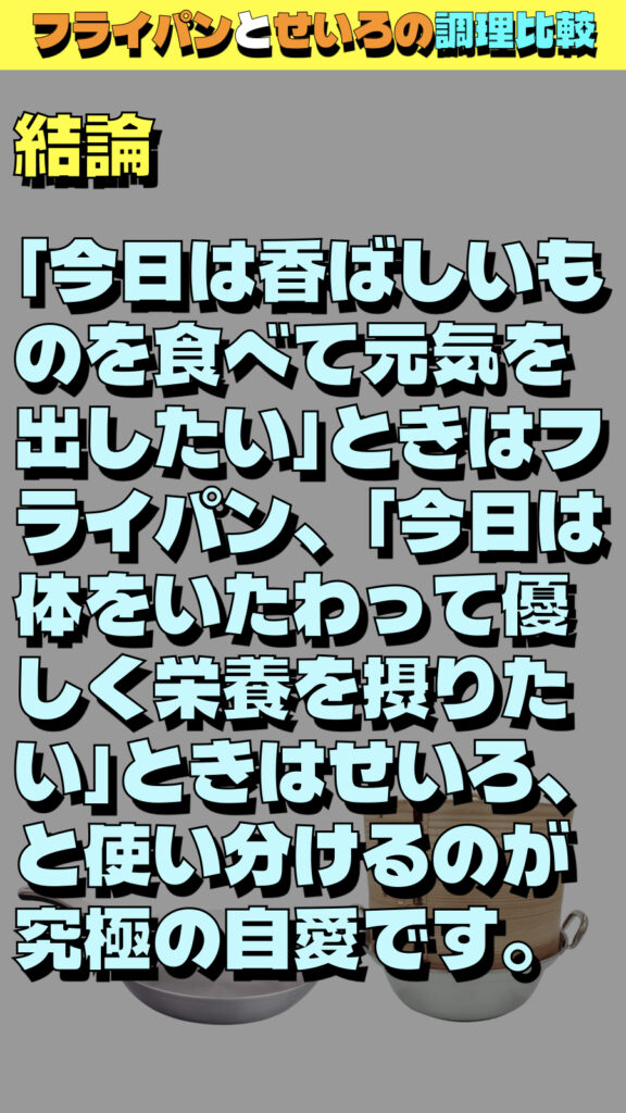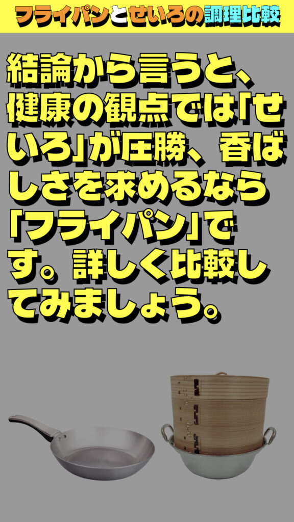 結論から言うと、健康の観点では「せいろ」が圧勝、香ばしさを求めるなら「フライパン」です。詳しく比較してみましょう。