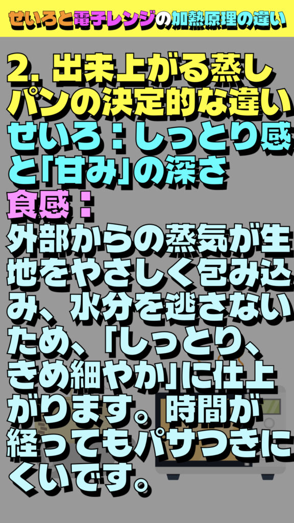 食感: 外部からの蒸気が生地をやさしく包み込み、水分を逃さないため、「しっとり、きめ細やか」に仕上がります。時間が経ってもパサつきにくいです。
