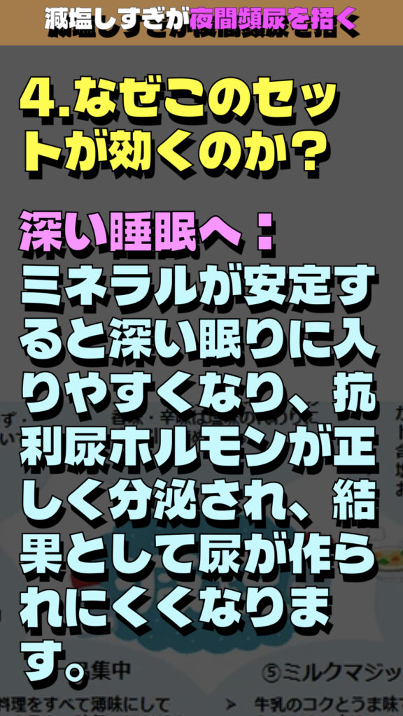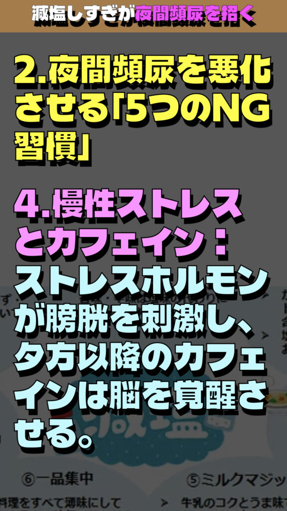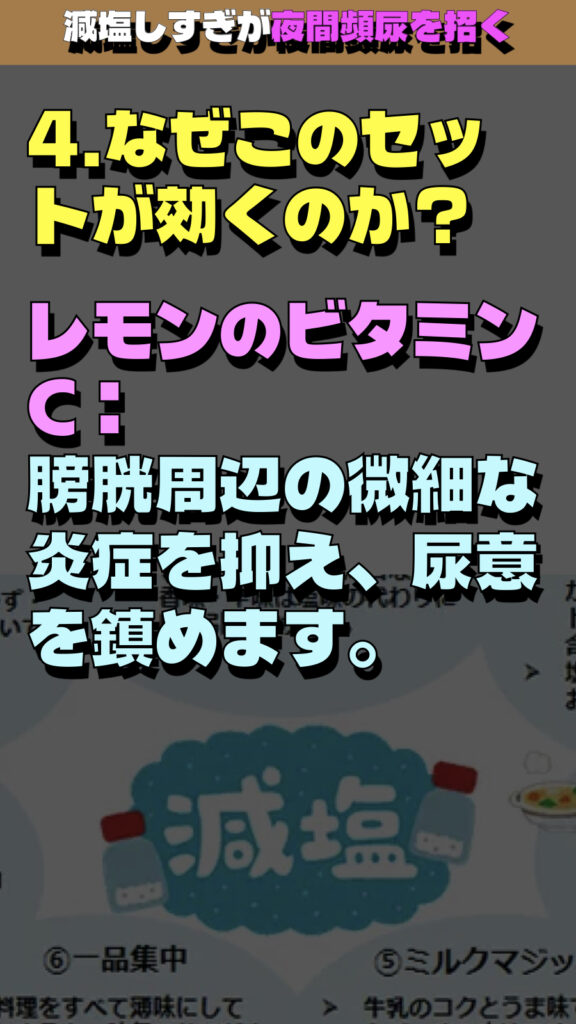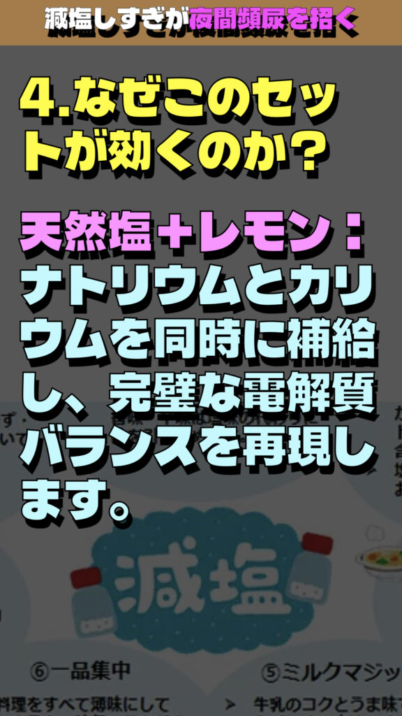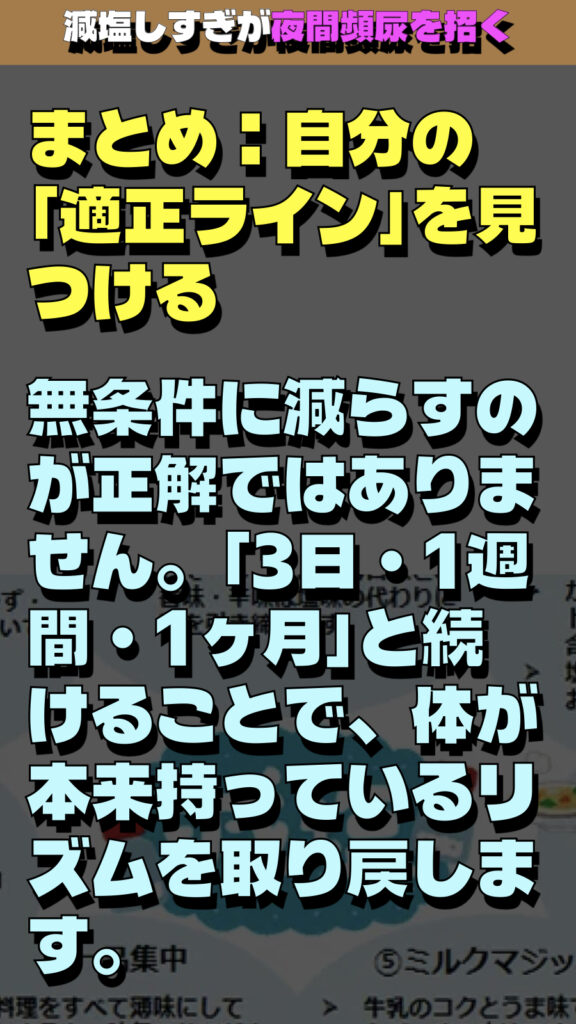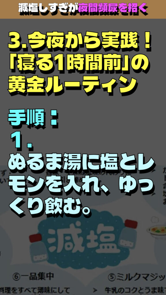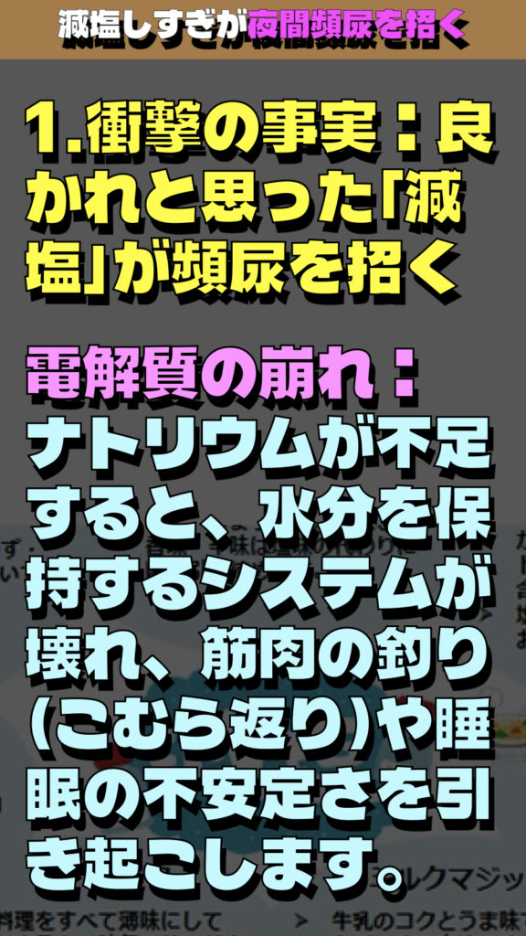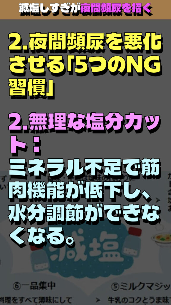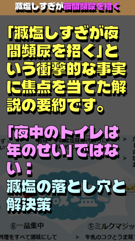 「減塩しすぎが夜間頻尿を招く」という衝撃的な事実に焦点を当てた解説の要約です。