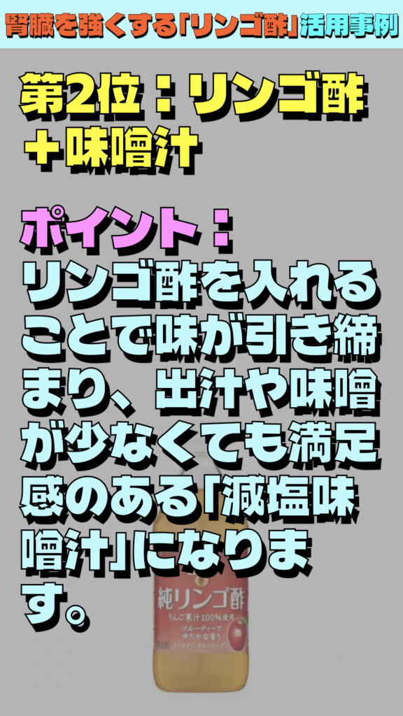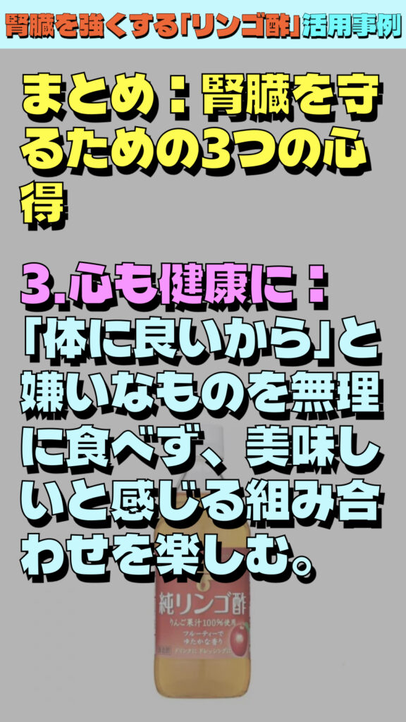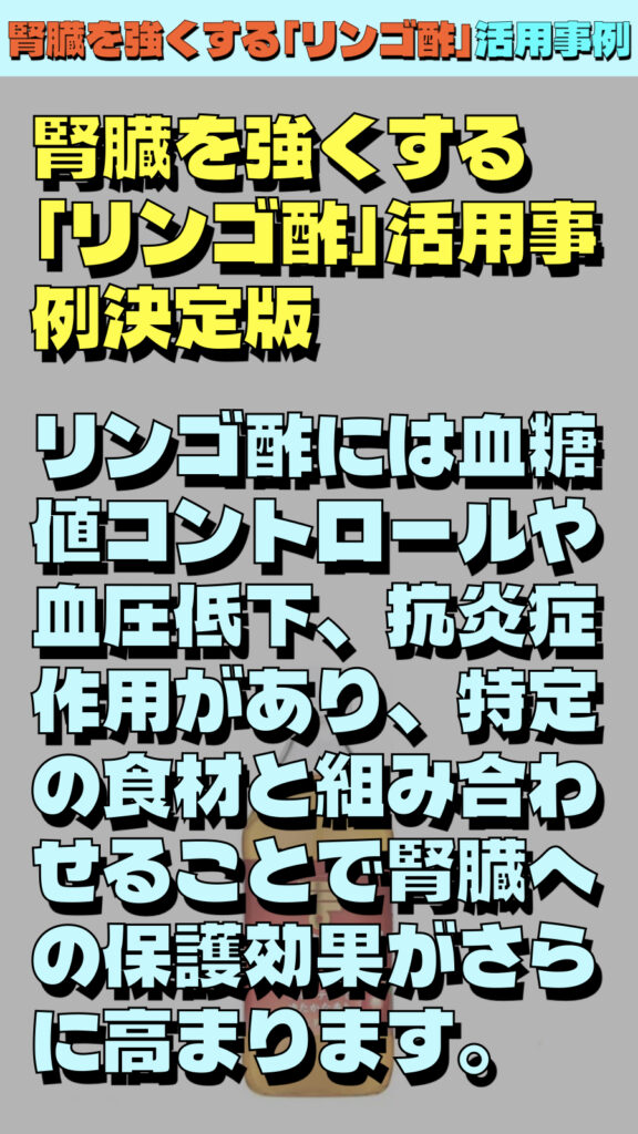 リンゴ酢には血糖値コントロールや血圧低下、抗炎症作用があり、特定の食材と組み合わせることで腎臓への保護効果がさらに高まります。