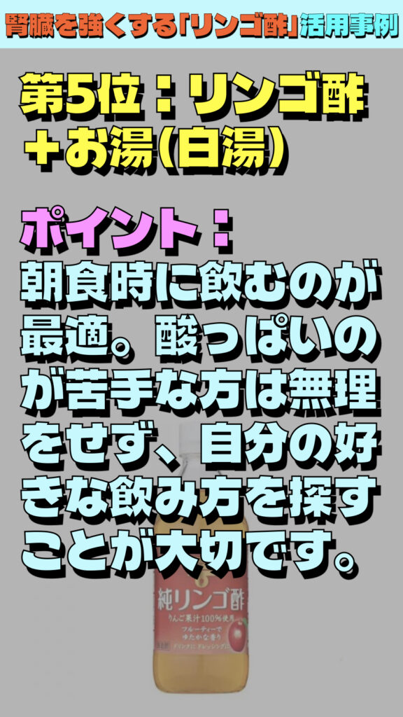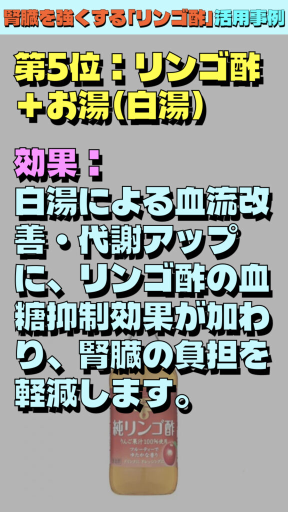 効果:白湯による血流改善・代謝アップに、リンゴ酢の血糖抑制効果が加わり、腎臓の負担を軽減します。