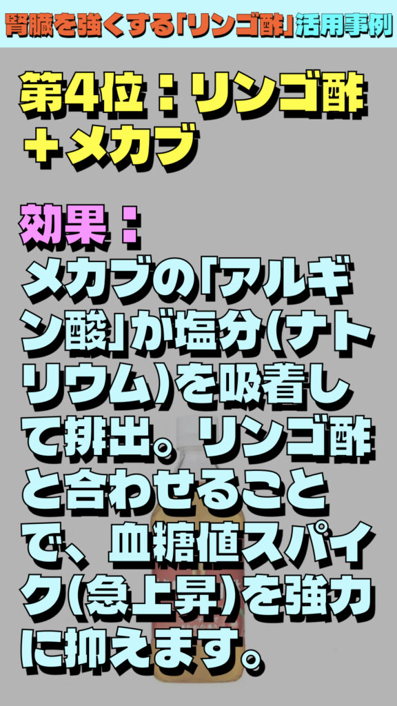 効果:メカブの「アルギン酸」が塩分(ナトリウム)を吸着して排出。リンゴ酢と合わせることで、血糖値スパイク(急上昇)を強力に抑えます。
