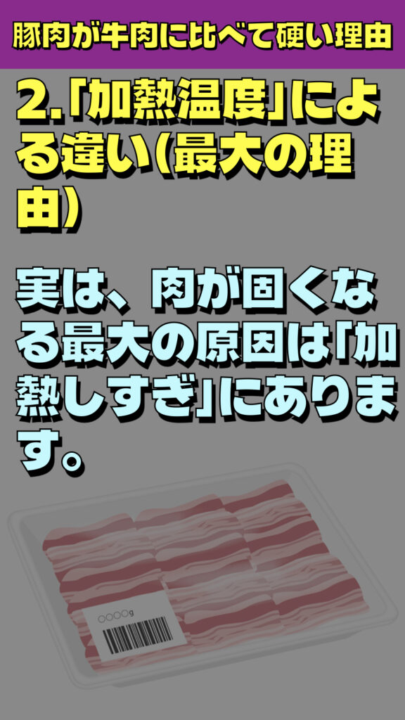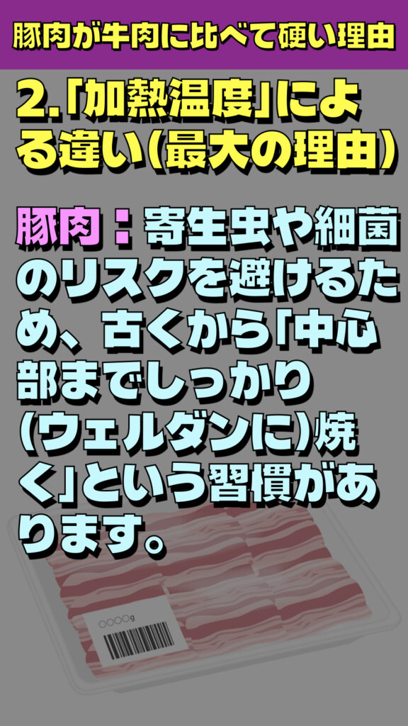 実は「豚肉の方が硬い」と感じるのには、科学的な理由と、私たちが無意識に行っている「安全のための調理習慣」という2つの大きな理由があります。
