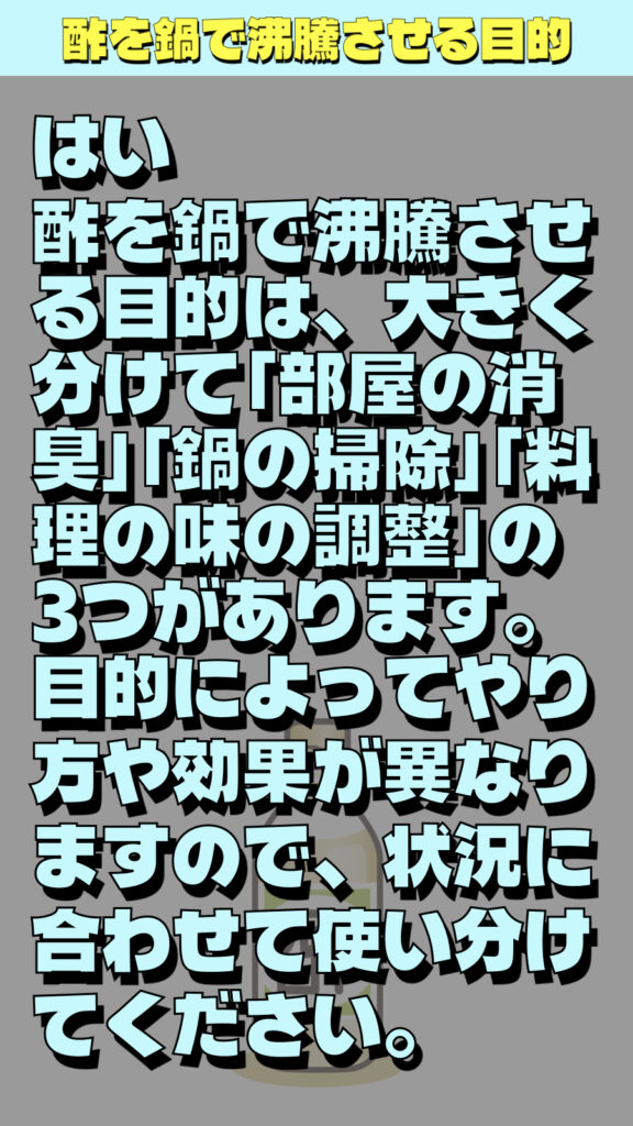 酢を鍋で沸騰させる目的は、大きく分けて「部屋の消臭」「鍋の掃除」「料理の味の調整」の3つがあります。