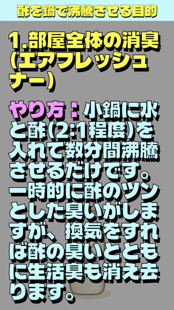 やり方:小鍋に水と酢(2:1程度)を入れて数分間沸騰させるだけです。一時的に酢のツンとした臭いがしますが、換気をすれば酢の臭いとともに生活臭も消え去ります。