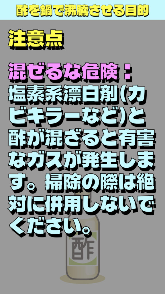 混ぜるな危険:塩素系漂白剤(カビキラーなど)と酢が混ざると有害なガスが発生します。掃除の際は絶対に併用しないでください。