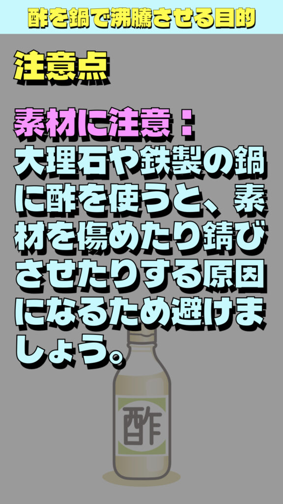 素材に注意:大理石や鉄製の鍋に酢を使うと、素材を傷めたり錆びさせたりする原因になるため避けましょう。