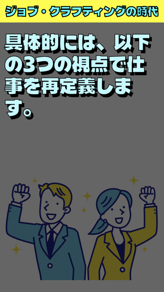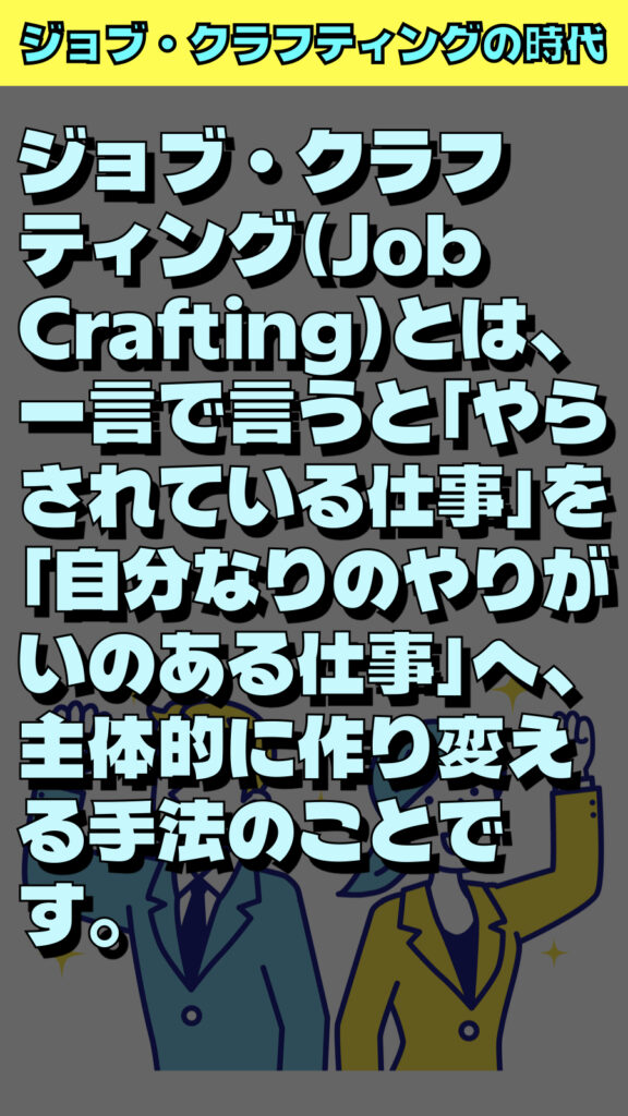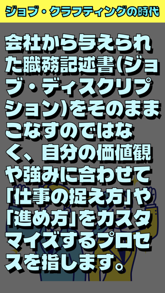 会社から与えられた職務記述書(ジョブ・ディスクリプション)をそのままこなすのではなく、自分の価値観や強みに合わせて「仕事の捉え方」や「進め方」をカスタマイズするプロセスを指します。