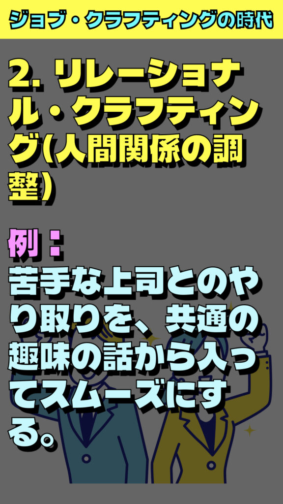 * 例: 苦手な上司とのやり取りを、共通の趣味の話から入ってスムーズにする。