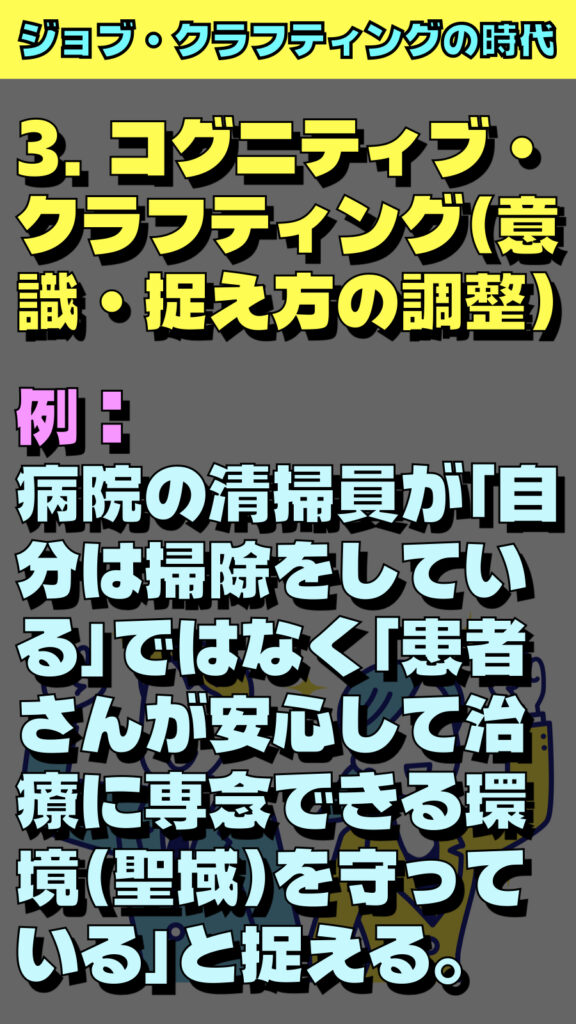 * 例: 病院の清掃員が「自分は掃除をしている」ではなく「患者さんが安心して治療に専念できる環境(聖域)を守っている」と捉える。