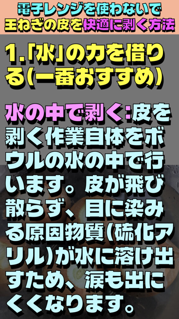 水の中で剥く:皮を剥く作業自体をボウルの水の中で行います。皮が飛び散らず、目に染みる原因物質(硫化アリル)が水に溶け出すため、涙も出にくくなります。