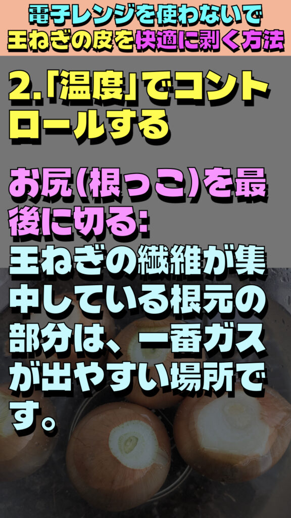お尻(根っこ)を最後に切る:玉ねぎの繊維が集中している根元の部分は、一番ガスが出やすい場所です。皮を剥く際は、先に頭(芽の方)を落としてから皮を剥き、根元は最後に切り落とすのがコツです。
