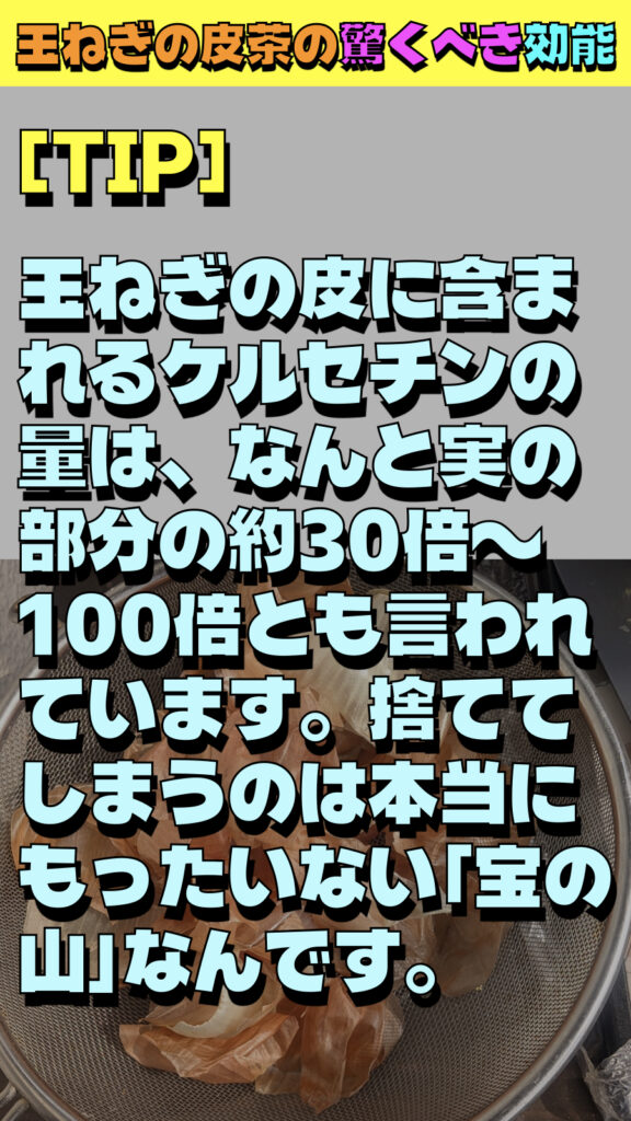 玉ねぎの皮に含まれるケルセチンの量は、なんと実の部分の約30倍〜100倍とも言われています。捨ててしまうのは本当にもったいない「宝の山」なんです。