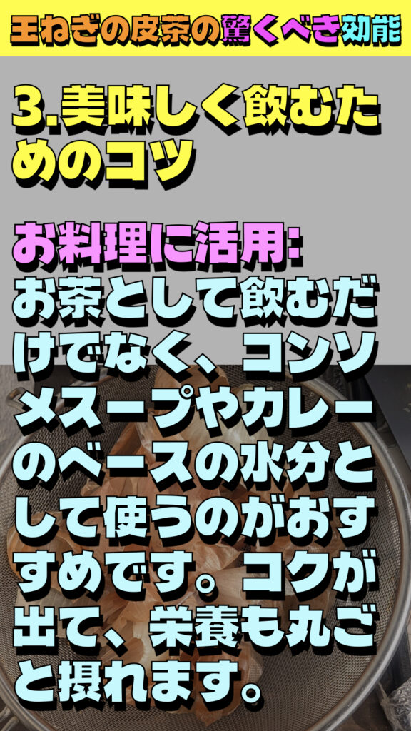 お料理に活用:お茶として飲むだけでなく、コンソメスープやカレーのベースの水分として使うのがおすすめです。コクが出て、栄養も丸ごと摂れます。