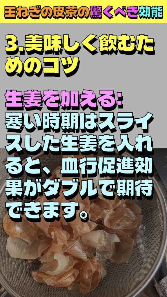 生姜を加える:寒い時期はスライスした生姜を入れると、血行促進効果がダブルで期待できます。
