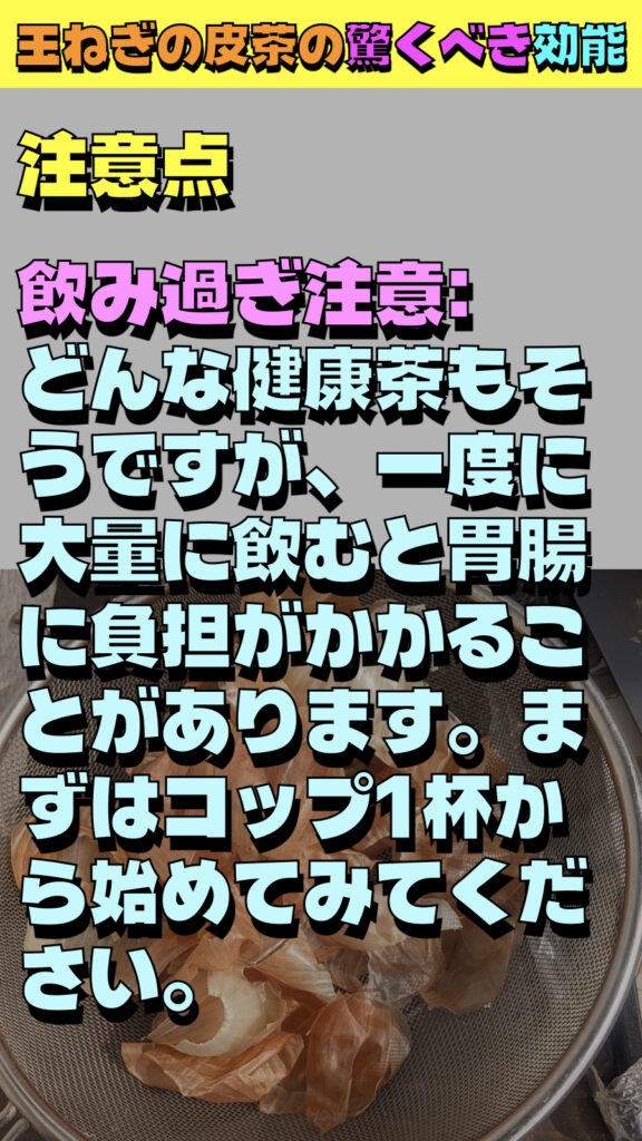飲み過ぎ注意:どんな健康茶もそうですが、一度に大量に飲むと胃腸に負担がかかることがあります。まずはコップ1杯から始めてみてください。