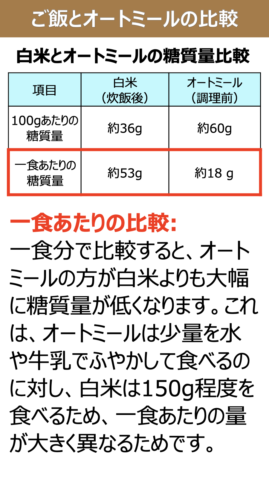 ご飯とオートミールの比較(糖質量、GI値、GL値)