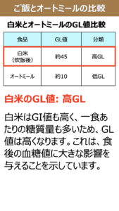 ご飯とオートミールの比較(糖質量、GI値、GL値)