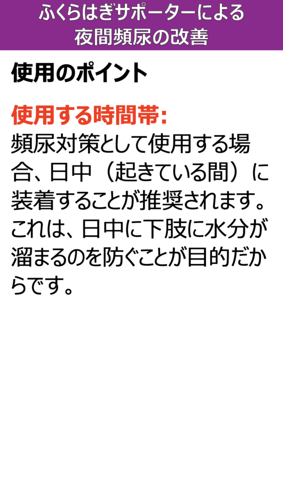 使用する時間帯: 頻尿対策として使用する場合、日中(起きている間)に装着することが推奨されます。これは、日中に下肢に水分が溜まるのを防ぐことが目的だからです。