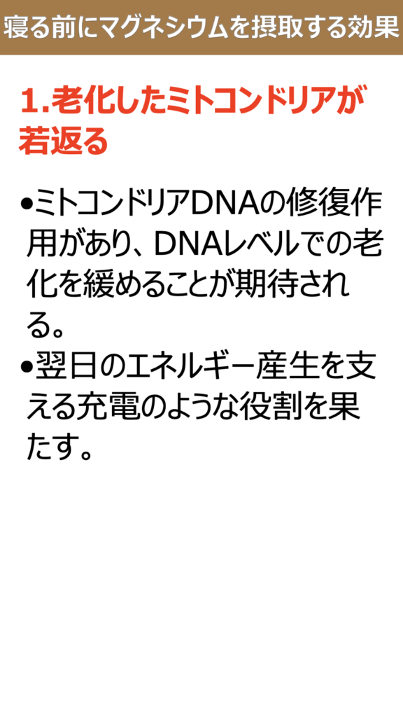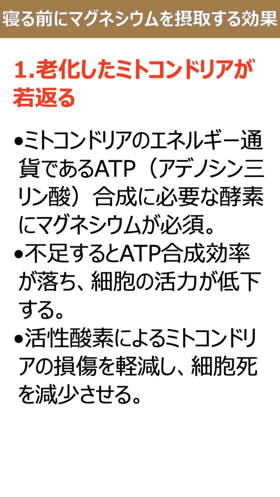 老化したミトコンドリアが若返る ミトコンドリアのエネルギー通貨であるATP(アデノシン三リン酸)合成に必要な酵素にマグネシウムが必須。