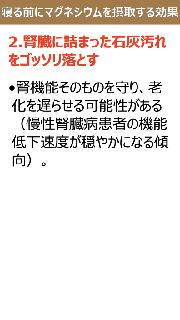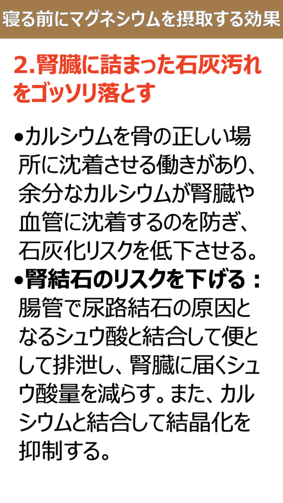 腎臓に詰まった石灰汚れをゴッソリ落とす カルシウムを骨の正しい場所に沈着させる働きがあり、余分なカルシウムが腎臓や血管に沈着するのを防ぎ、石灰化リスクを低下させる。
